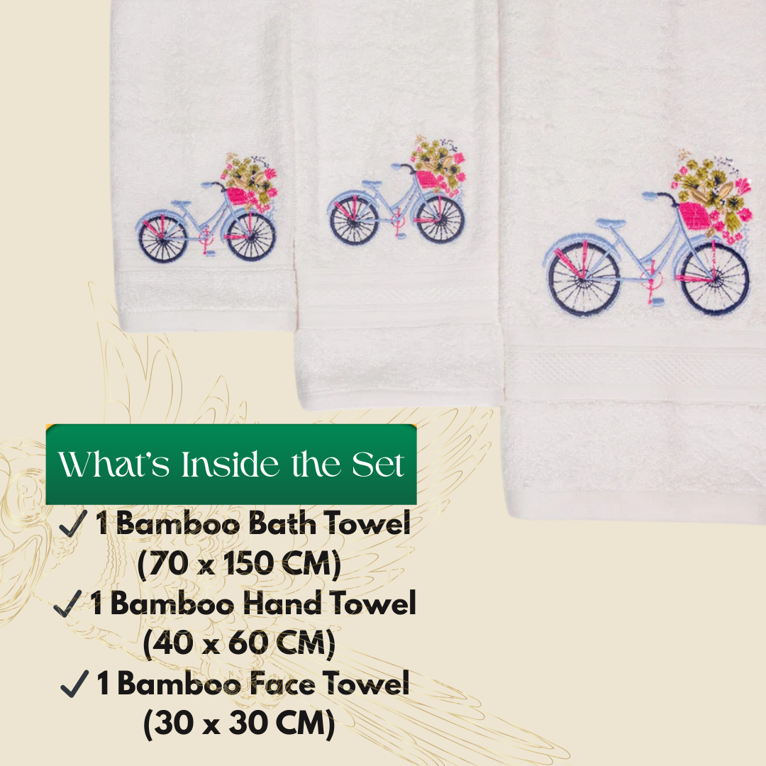 Mrijaa Bamboo Bath Set | Set of 3 | Vintage Bicycle Bliss | White